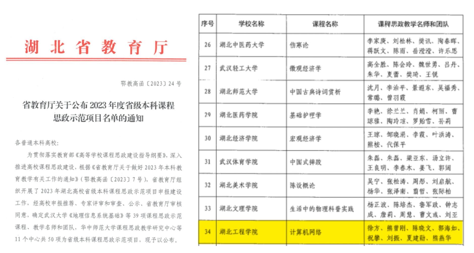 近日,湖北省教育厅发布了《省教育厅关于公布2023年度省级本科课程思政示范项目认定结果的通知》(鄂教高函〔2023〕24号)《省教育厅关于公布2023年度省级优秀基层教学组织认定结果的通知》(鄂教高函〔2023〕23号),我院《计算机网络》被认定为省级课程思政示范课程,课程负责人徐方老师及教学团队获批省级课程思政教学名师和团队。