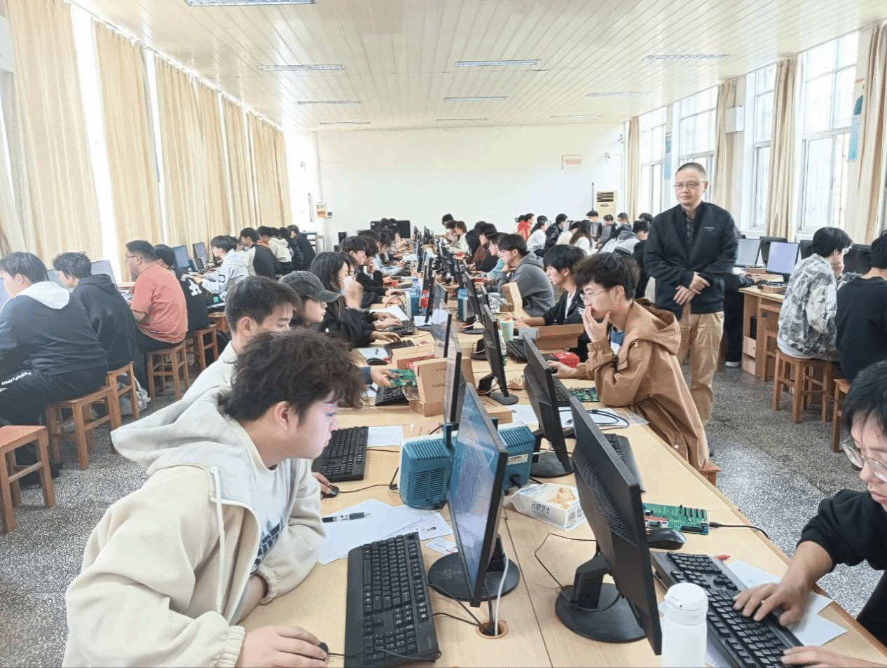 9428cn太阳集团成功承办了第十六届"蓝桥杯"全国软件和信息技术专业人才大赛线下个人赛。本次赛事呈现出鲜明的跨专业辐射效应,软件类竞赛吸引了来自我校计算机学院、数学与统计学院、经济与管理学院、土木工程学院等跨专业学子的积极参与,并主动服务孝感市多所高职院校,最终形成230人规模的参赛阵容;电子类竞赛同样展现多元化特点,除计算机学院、物理与电子信息工程学院等理工科专业外,更吸引了新技术学院及周边高校的139名选手同场竞技。从参赛选手选拔培训、赛场氛围设计、监考设备准备到赛点布置、监考教师选派、线上线下双渠道组织比赛等诸多环节全程参与的重大比赛项目。