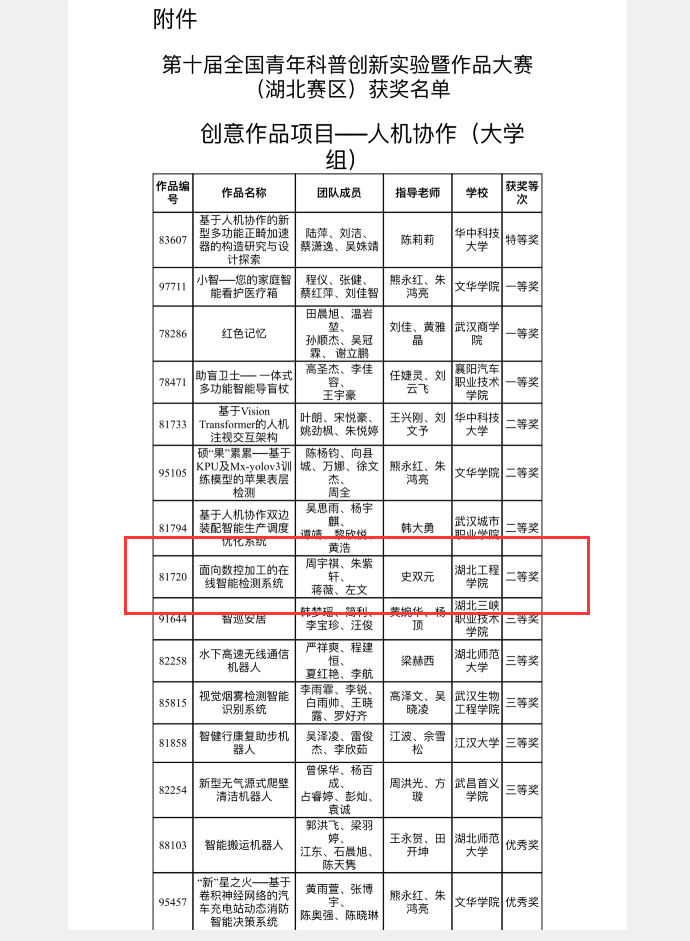2024 年 6 月 11 日讯,5 月 26 日,第十届全国青年科普创新实验暨作品大赛复赛在湖北省科学技术馆举行。计算机信息与科学学院的创新实验团队在此次复赛中表现出色,最终成功斩获本科组(人机协作)省级二等奖。