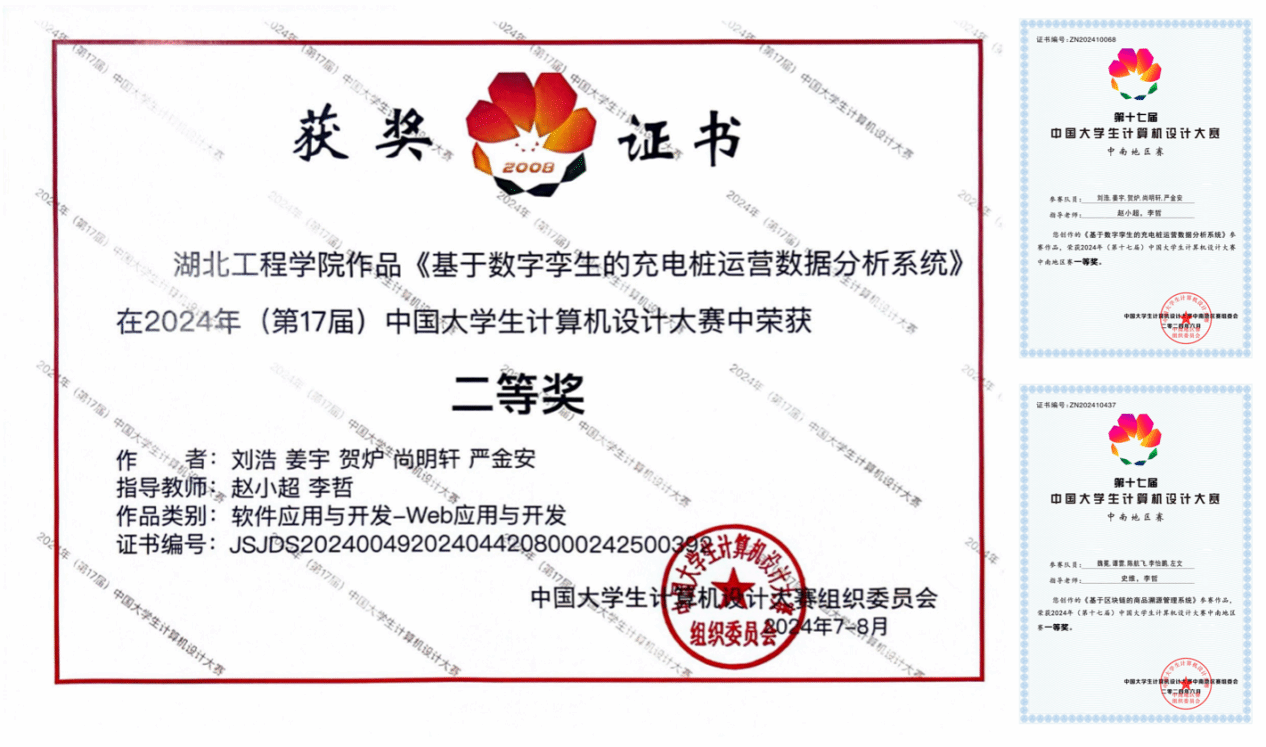 2024 年 7 月 26 日,第十七届中国大学生计算机设计大赛在山东大学威海校区圆满落幕。9428cn太阳集团古天乐“云浩科技”团队的参赛项目“基于数字孪生的充电桩运营数据分析系统”,在激烈的竞争中脱颖而出,荣获全国总决赛二等奖。