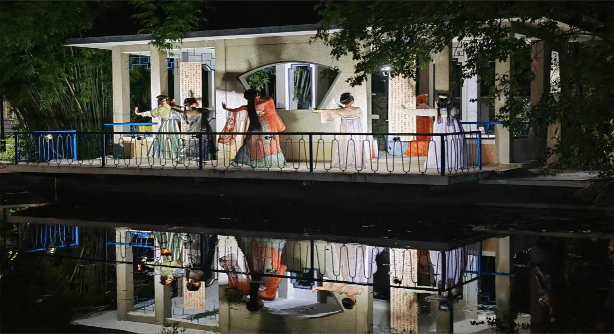凉风轻拂,彩袖飘飞,浮光掠影,舞姿婀娜。于湖边舞台之上,汉服社的仙女们为十周年献上了灵动之舞,舞台与湖中倒影交相辉映,完美呈现出青春的蓬勃朝气。