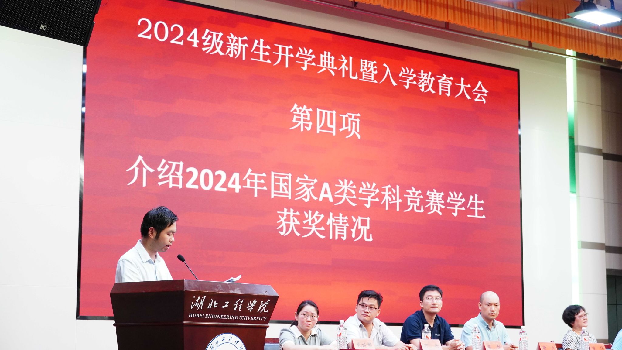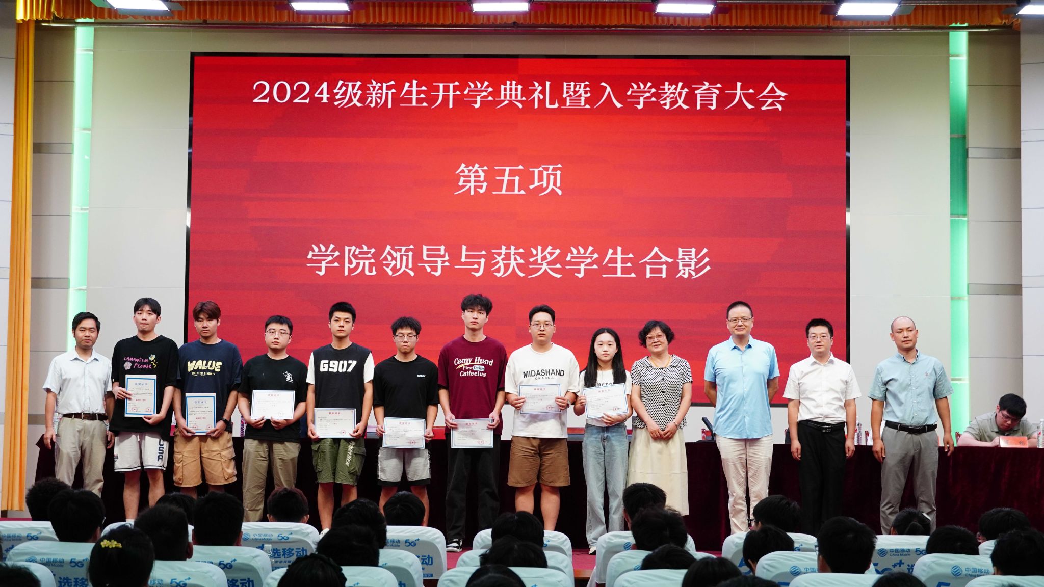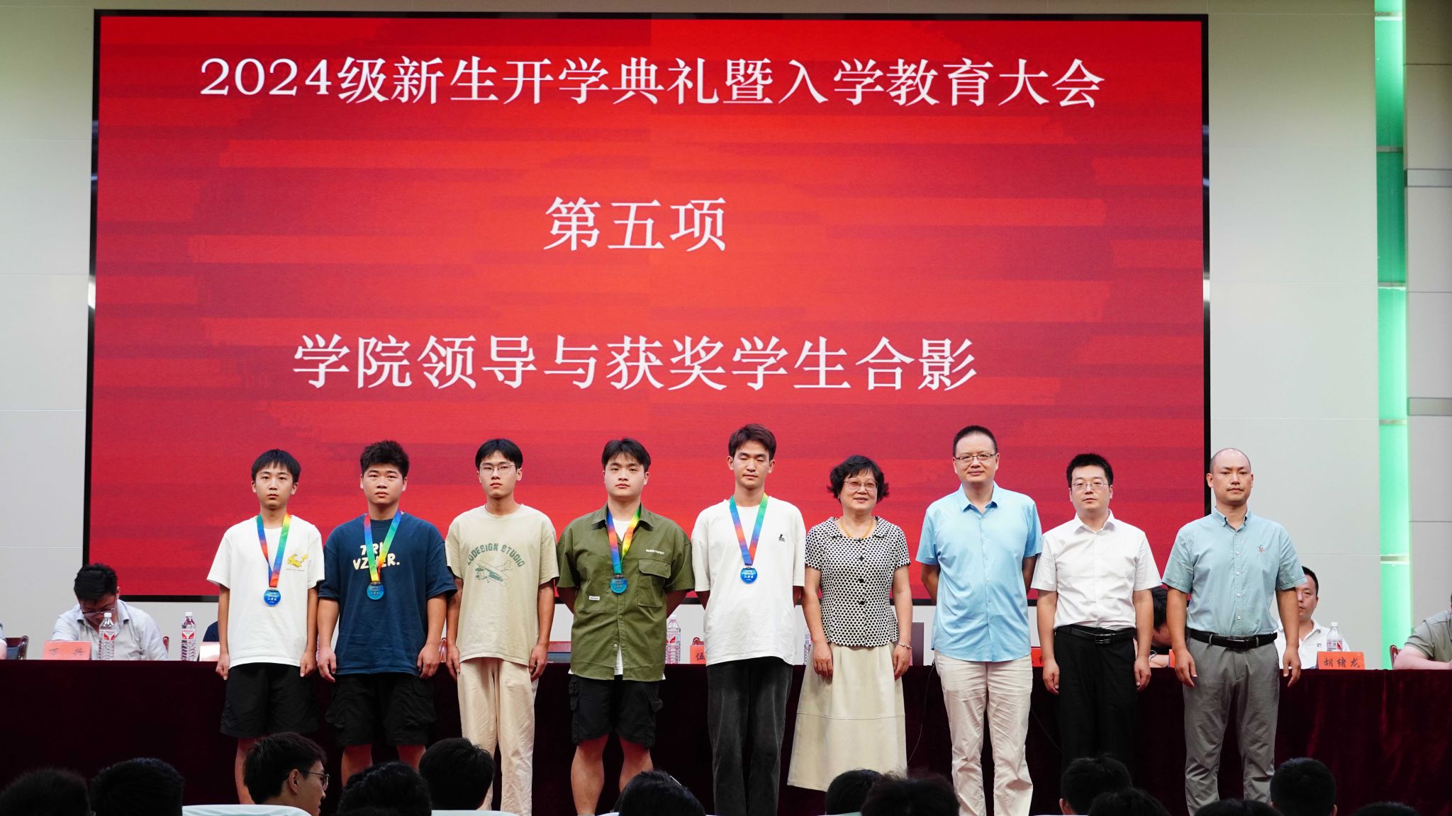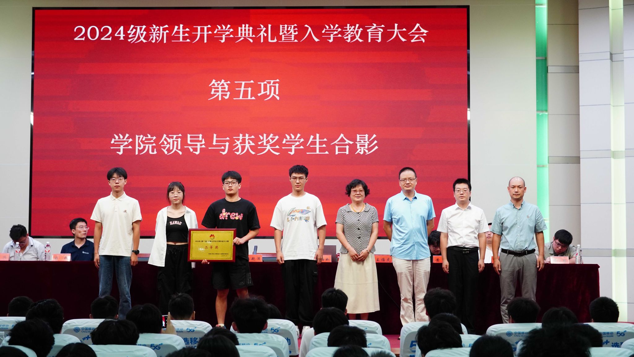 接着,大会主持人熊伟介绍了学院在2024年国家A类学科竞赛学生获奖情况。学院领导与获奖学生依次握手并合影留念,这一时刻激励着新同学们以优秀的学长学姐为榜样,努力拼搏,为自己的大学生活增添绚丽光彩。