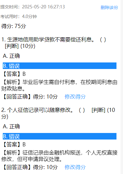 5月18日,组织50余名2025届生源地贷款学生开展诚信主题班会,会上辅导员朱柯彪老师详细为学生解读助学贷款还款流程、征信体系、还款注意事项及违约后果,重点强调按时还款对于个人信用征信的重要性。会后组织学生开展诚信知识答题线上答题,题目涵盖国家助学贷款政策、还款流程、征信知识、失信后果等内容,题型包括单选题、多选题和判断题,活动期间,学生们踊跃参与,许多学生表示,通过答题不仅巩固了还款知识,还认识到失信行为对个人发展的严重危害。