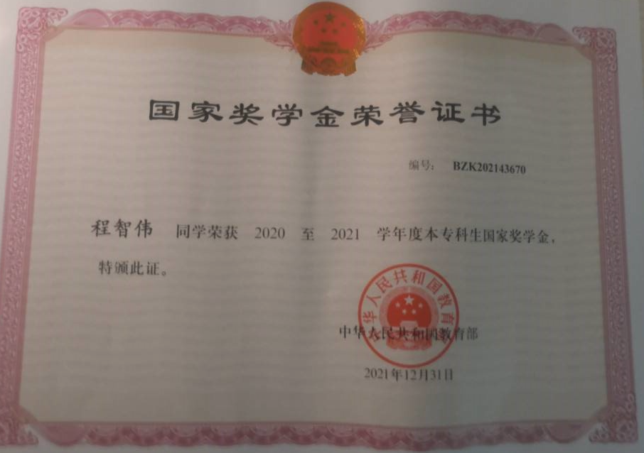 在学习方面,程智伟在2020-2021学年中以班级综合排名第1名,大学四年平均绩点3.59/(0-4.0)。程智伟始终应以学业为主,在课堂上始终保持端正、谦虚的学习态度,积极配合老师教学,努力提高自己的专业知识水平;课下虚心向同学请教,认真预习及完成老师所布置的作业和实验。