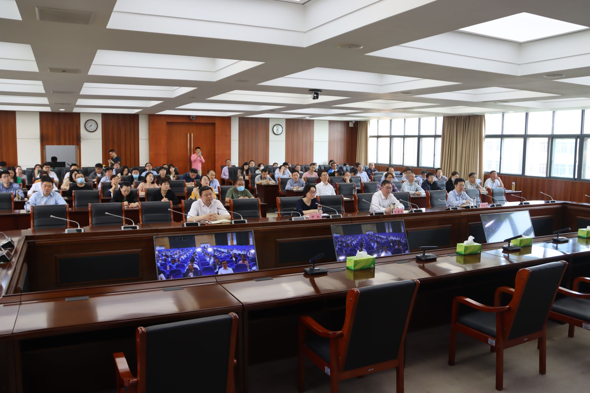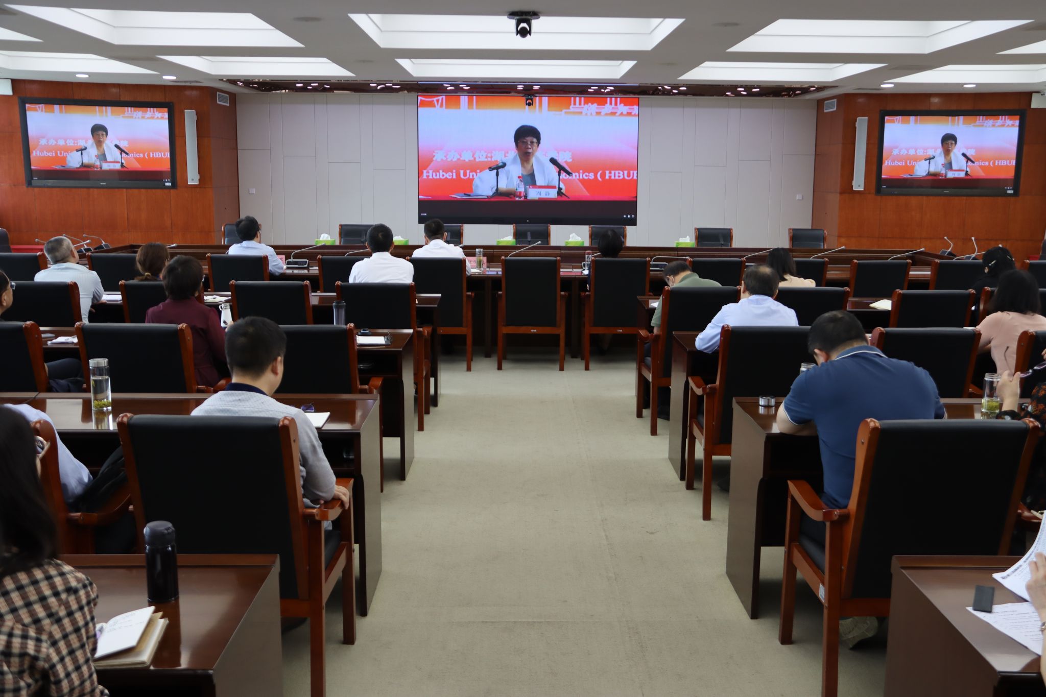 学校校长汪海波,纪委书记、监察专员邹虹,党委常委、副校长覃彩芹,党委常委、组织部长郑俊及各职能部门负责人,各教学学院书记、院长、专业负责人在明德楼6楼会议室参加线上分会场会议。学校党委副书记陈伟,党委常委、统战部长熊曾刚及教务处、质评中心、学工部主要负责人在湖北经济学院参加线下主会场会议。